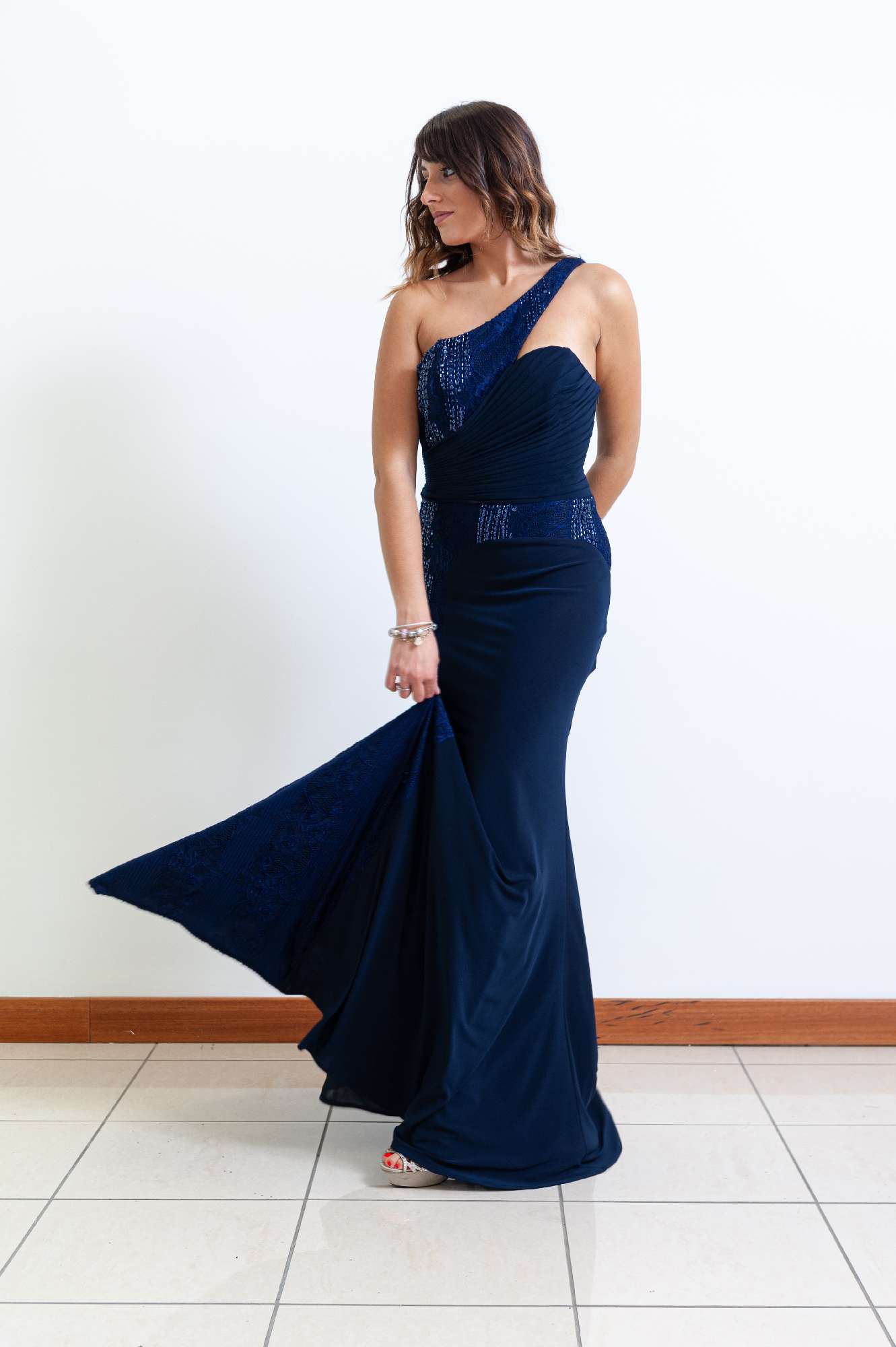Abito lungo blu con dettagli in pizzo e applicazioni di pagliette, monospalla